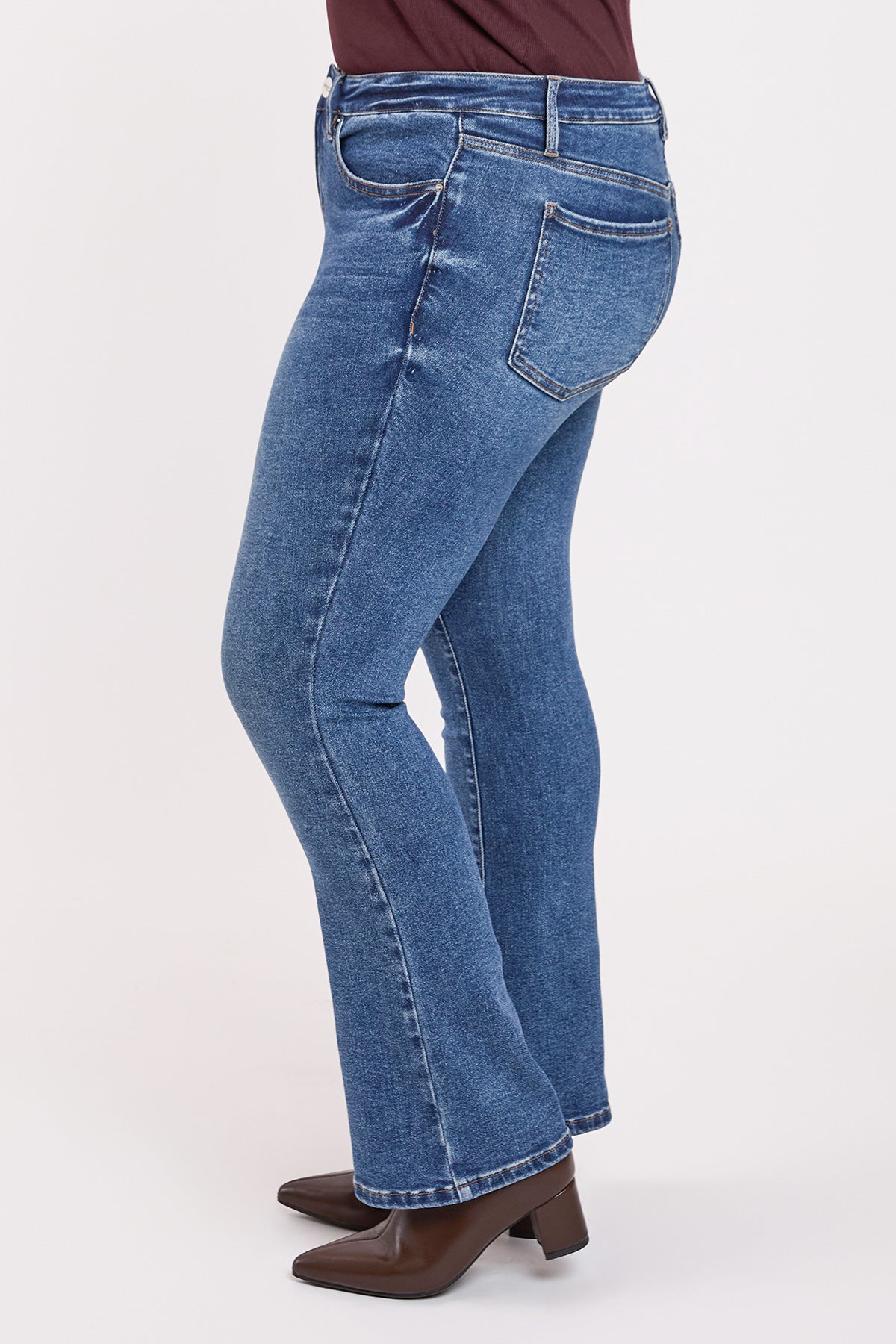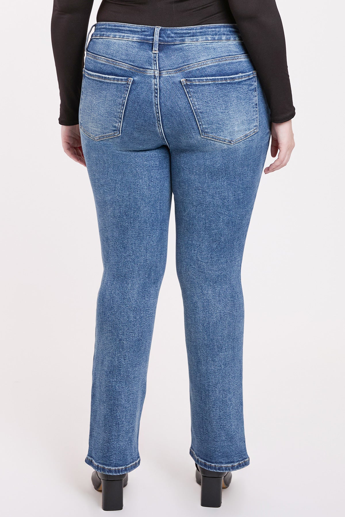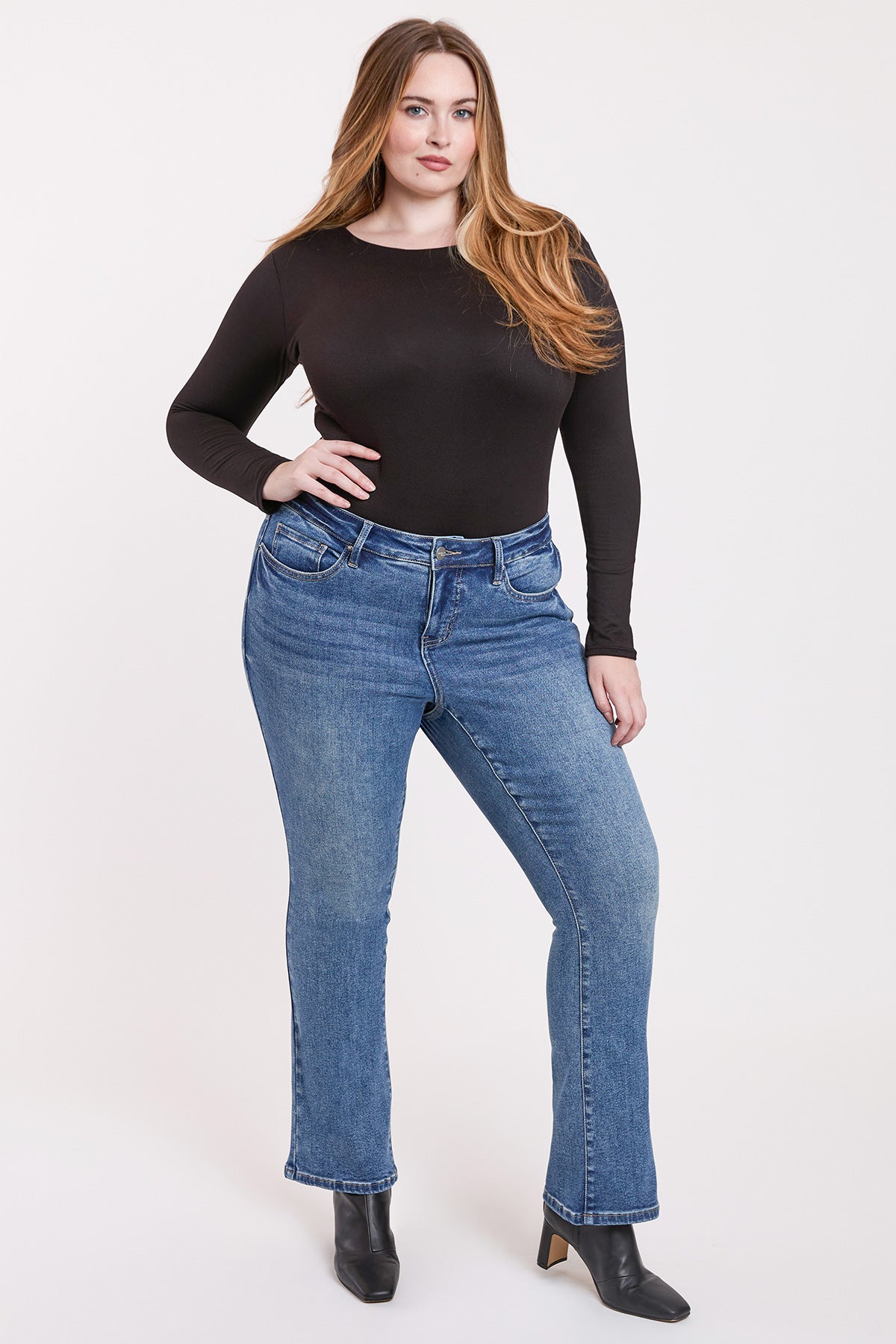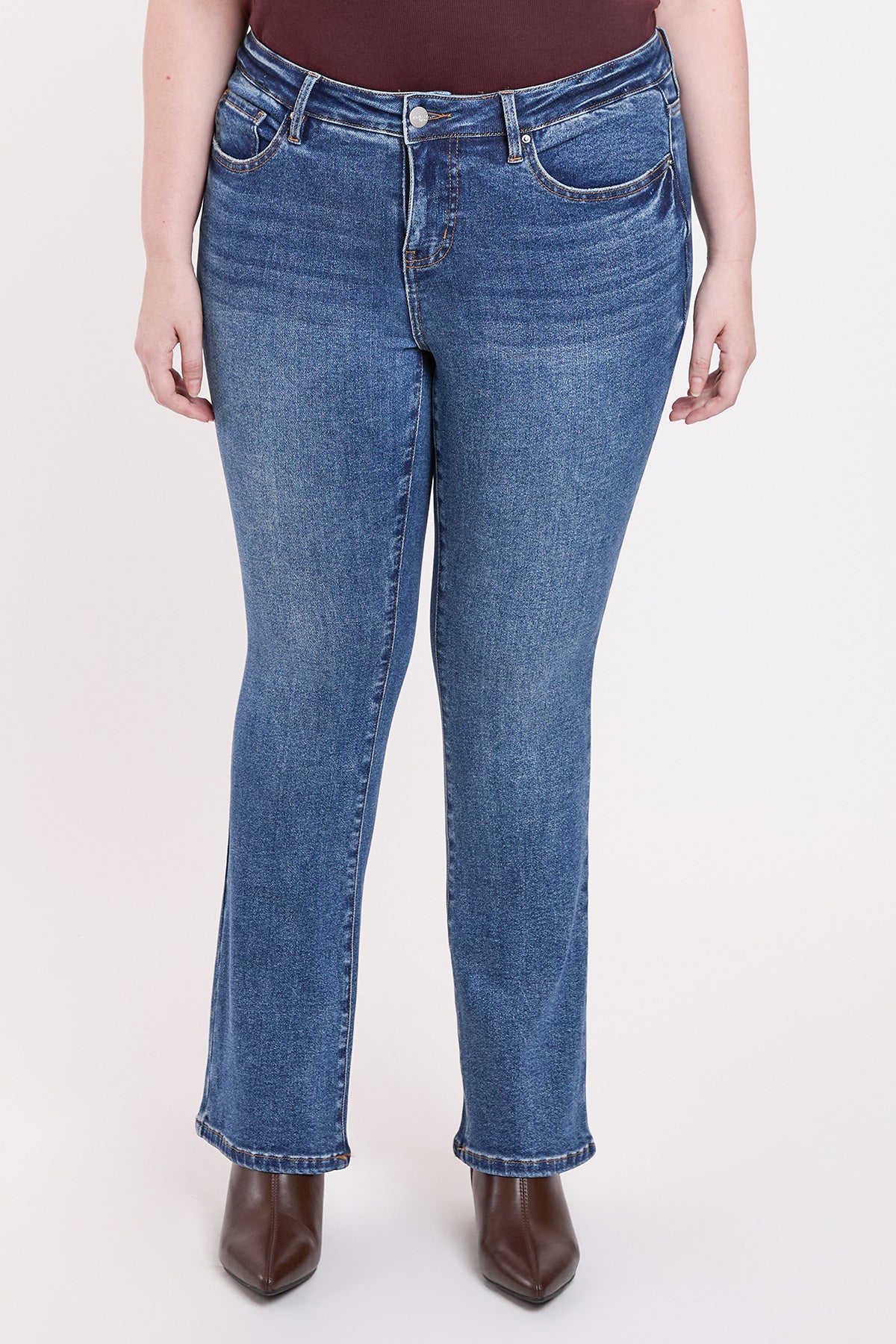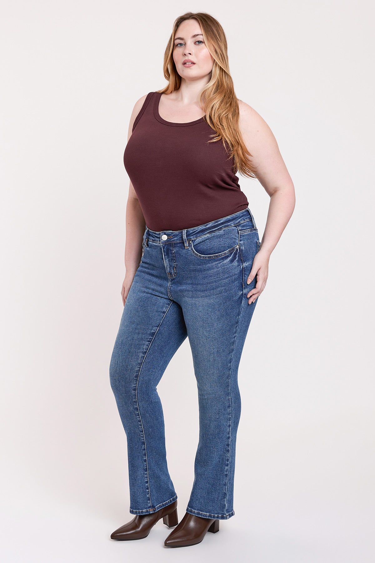 The high-rise waist and double-button closure provide extra support and a smooth, held-in feel. A bootcut leg adds balance and versatility, making them perfect to pair with boots, sneakers, or heels. Finished with functional pockets, belt loops, and a zip fly—these jeans are a must-have for effortless, everyday style.