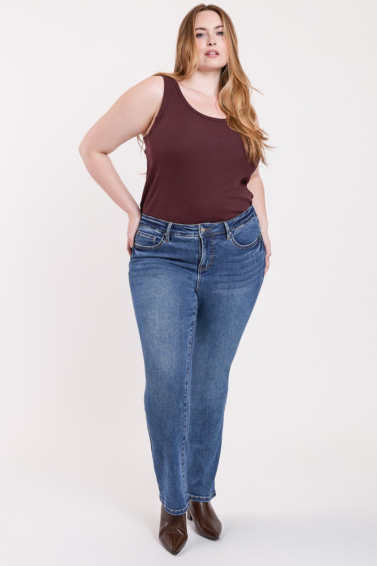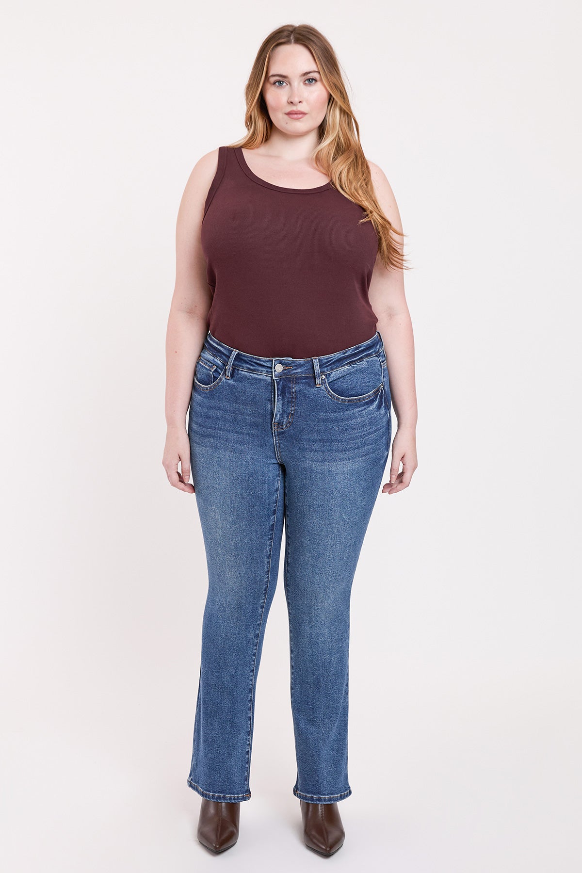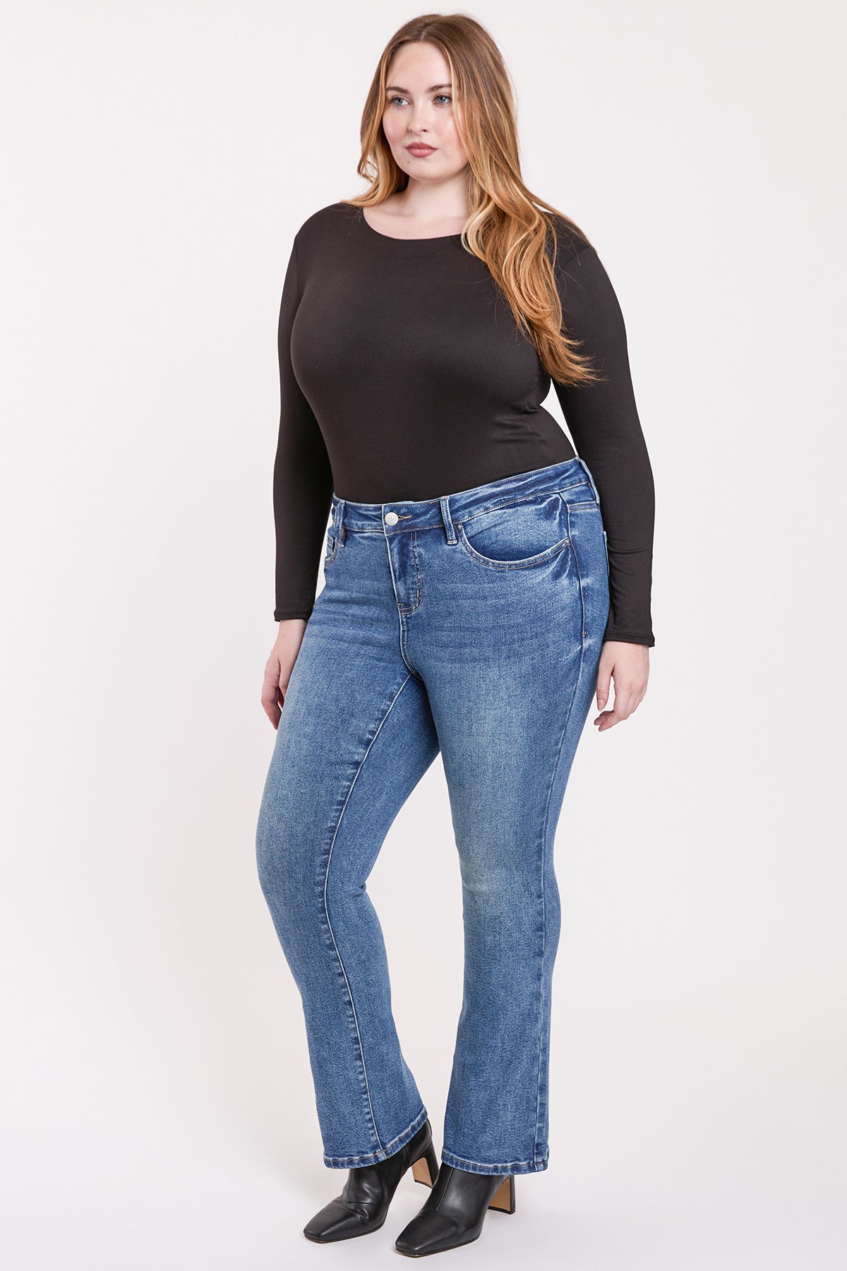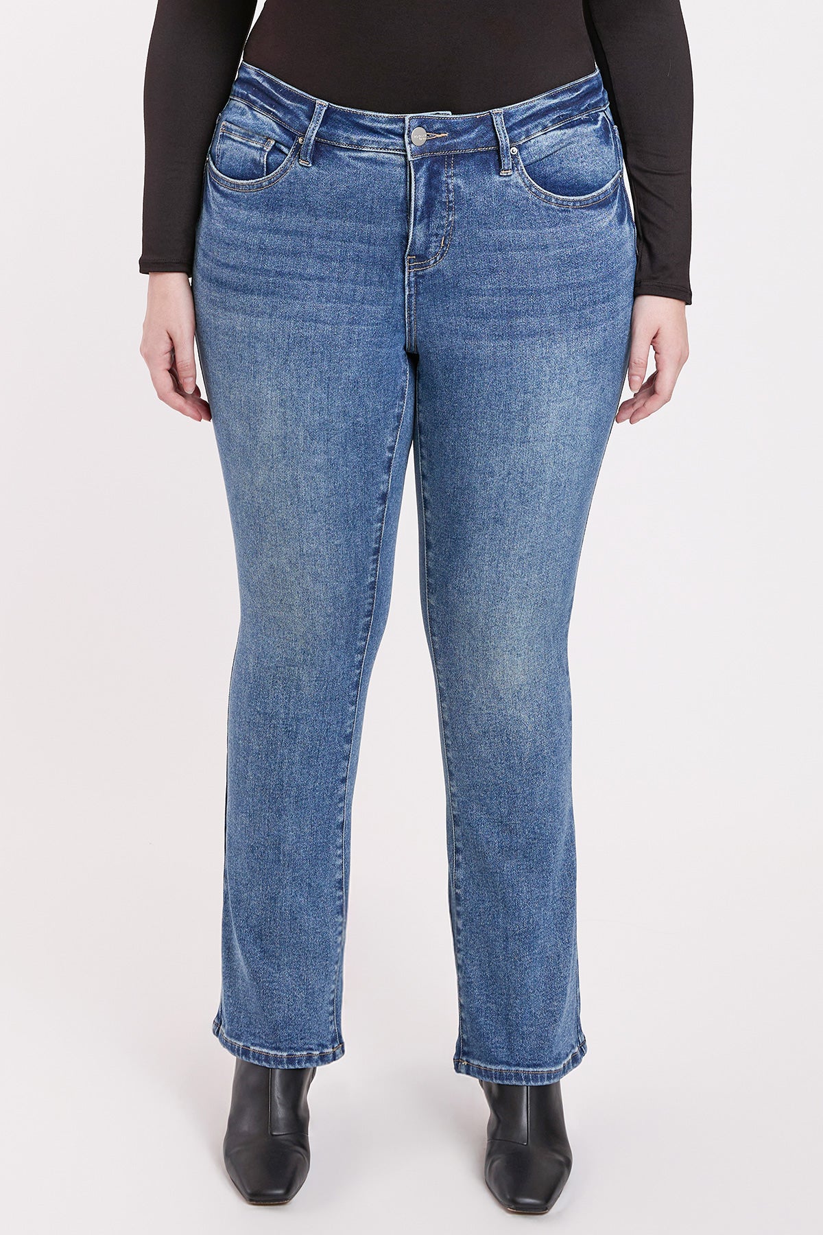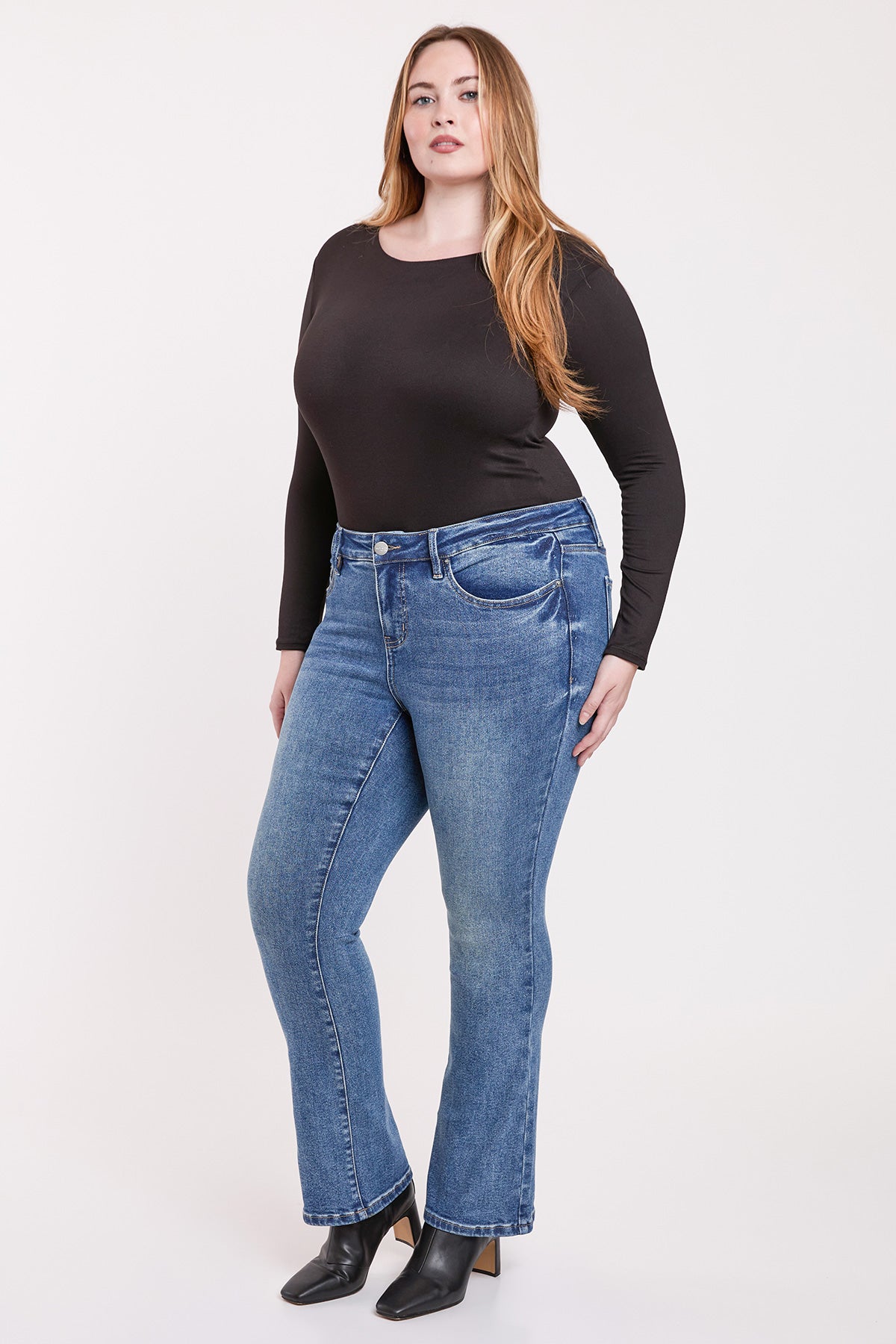 The high-rise waist and double-button closure provide extra support and a smooth, held-in feel. A bootcut leg adds balance and versatility, making them perfect to pair with boots, sneakers, or heels. Finished with functional pockets, belt loops, and a zip fly—these jeans are a must-have for effortless, everyday style.