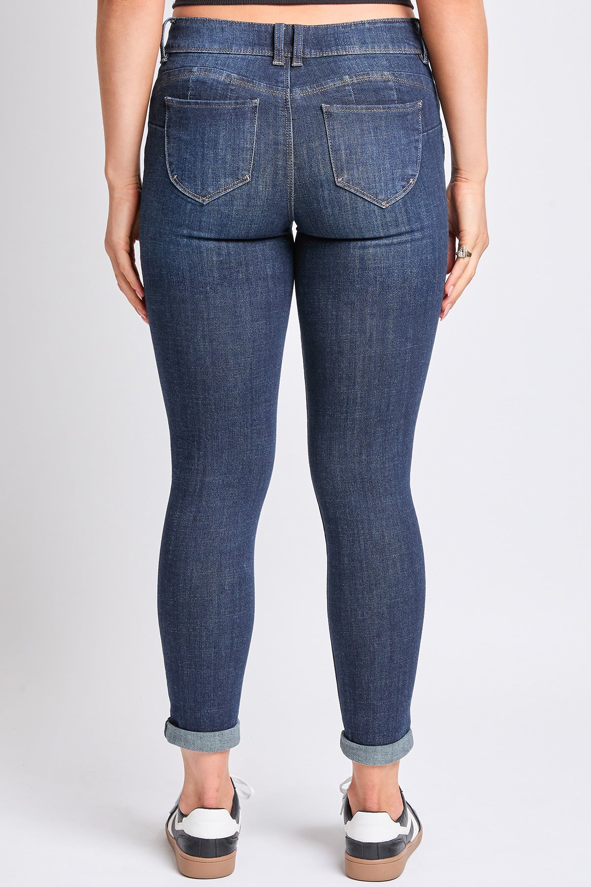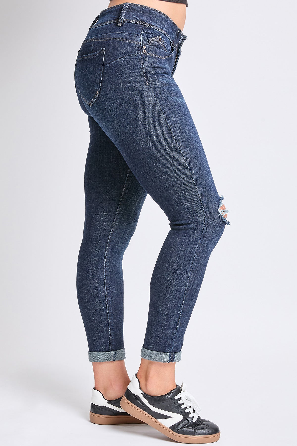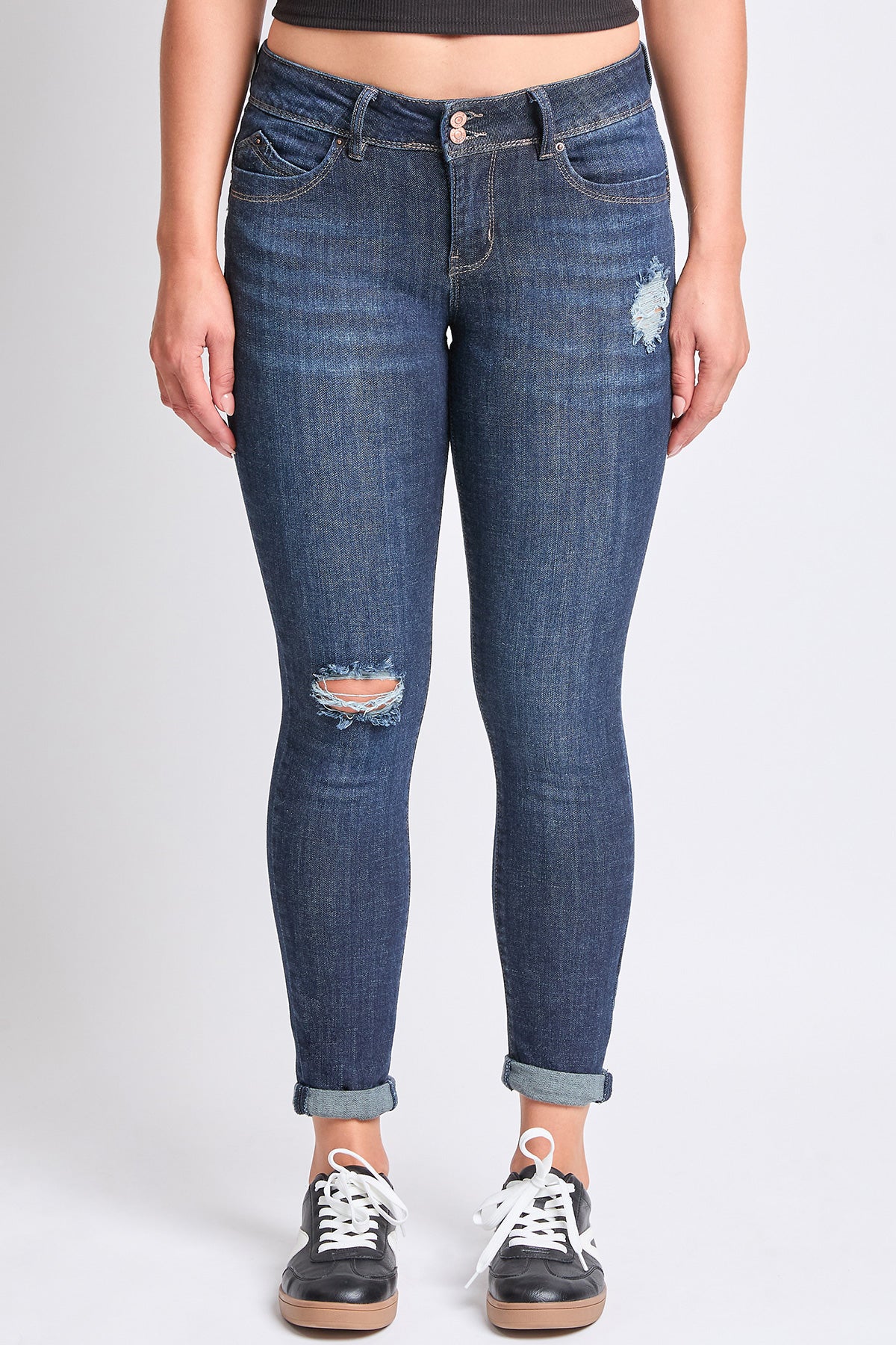 Our Women's WannaBettaButt Mid Rise Double Button Rolled Cuff Ankle Jean is your new best friend! Made with our signature butt-lifting design, these mid-waisted jeans feature slight distressed detailing along the front, optional rolled cuffs, a classic five-pocket construction, double-button closure with front zip, and belt loops. Pair with a crochet crop top for a trendy look.