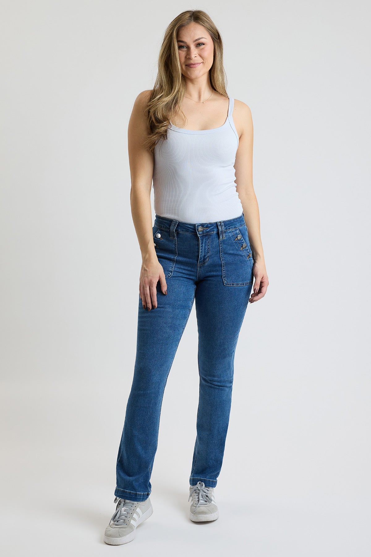Add a touch of nautical-inspired style to your wardrobe with these Women’s High Rise Sailor Bootcut Jeans. Featuring a flattering high-rise fit, these jeans are designed to accentuate your waist and create a smooth, elongated silhouette. The bootcut design offers a timeless, figure-flattering look, while the distinctive button detail on the patch pockets and hem stitching provide a vintage-inspired flair. Perfect for both casual outings and dressier occasions, these jeans bring classic elegance with a modern twist.