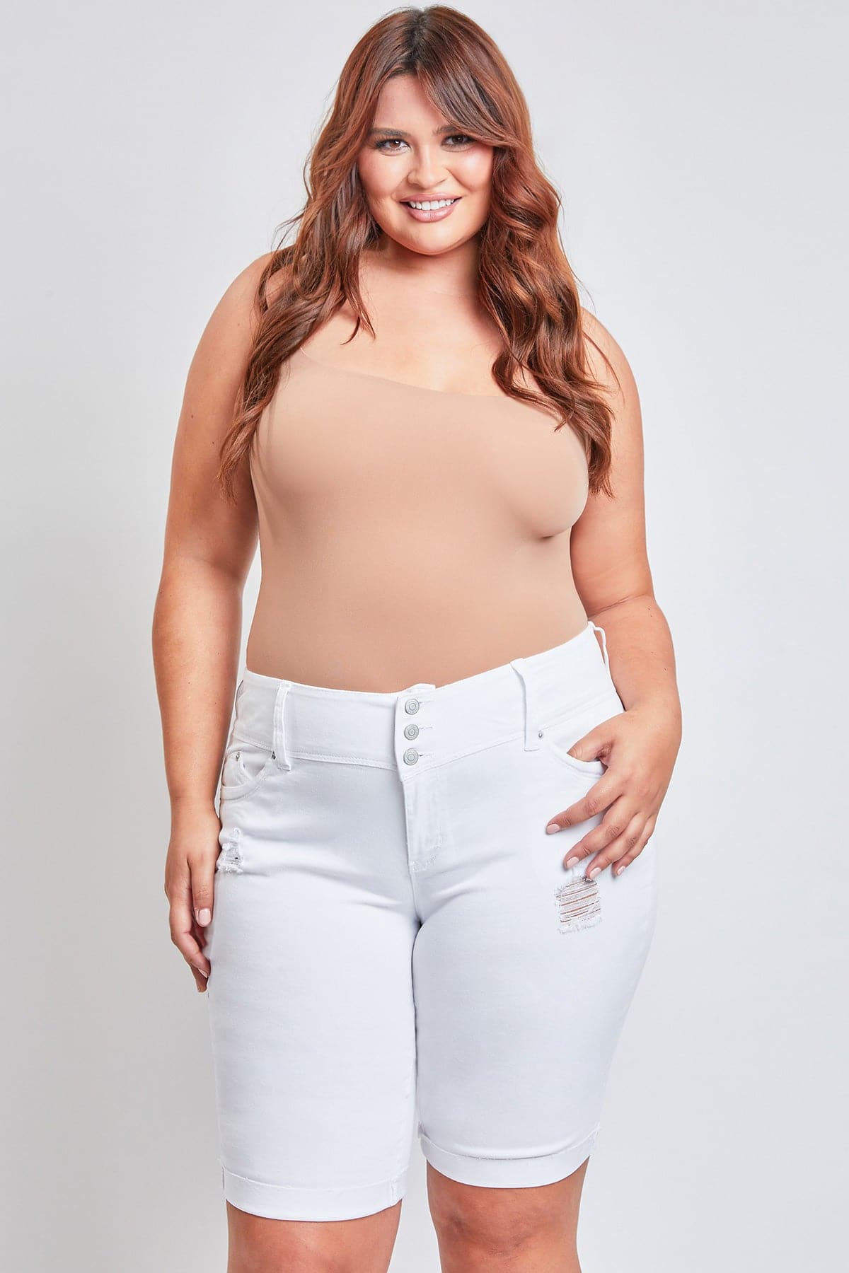 We’ve got your perfect weekender short in our Women’s Plus WannaBettaButt Cuffed Raw Edge Bermuda Shorts! These long denim shorts feature our signature WBB heart-shaped stitching and perfectly placed pockets that enhance your natural curves and give your bum a lifted look. Accented with a cuffed raw hem and ripped detailing for that cool girl edge. Style with a white tank and sneakers for a look that will take you on any weekend adventure.