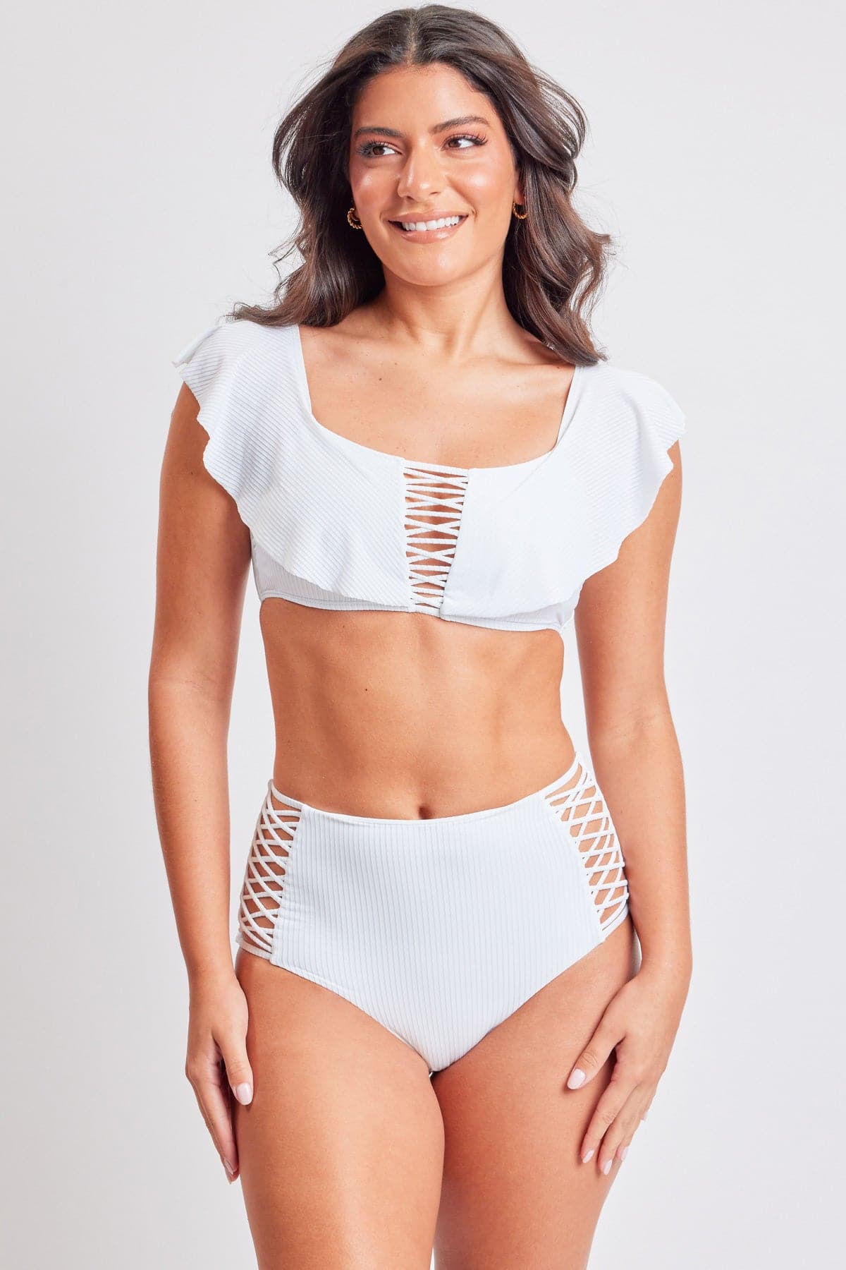 Ruffle some feathers in our women’s Heart & Sol Off Shoulder Flounce Bikini swimsuit. This two-piece bathing suit features vertical ribbing throughout and lace up detail at the front and sides. The flounced top gives a flirty, feminine touch, and the high-rise bottom sits up on the waist for a tummy-cinching look and hourglass shape. Style with your favorite cover up and sandals for a summer-chic ‘fit!