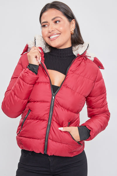 Keep it cozy this winter in our Puffer Jacket With Detachable Sherpa Fur Hoodie. Featuring a top faux fur liner inside and a Sherpa lined collar for extra softness and warmth. Designed with a water-resistant fabric to keep the rain and snow out. Also featuring zippered hand pockets and a detachable hood for convenience and ease. This jacket won’t just keep you warm and cozy, you’ll look stylish and cute too! Pair this with a long sleeve or turtle neck, some of our skinny jeans, and booties!