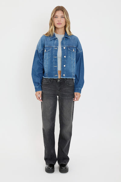 Add some edgy layers to your go-to outfits this season with our Women's Cropped Denim Jacket With Raw Hem. Complete with all standard trademarks: buttoned flap pockets, button-cuff long sleeves, exposed front button closure, basic collar, and a cropped fit with raw hem.