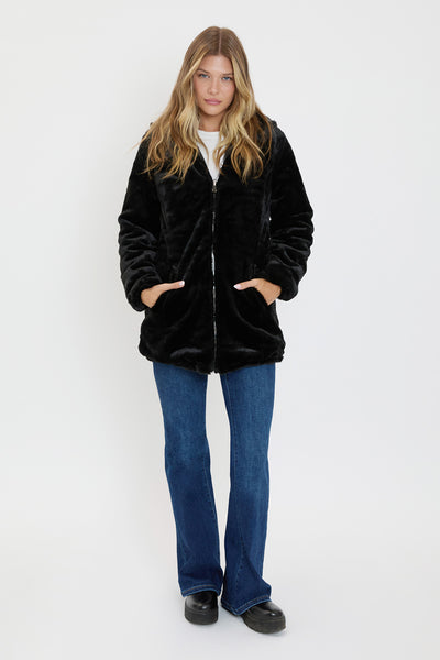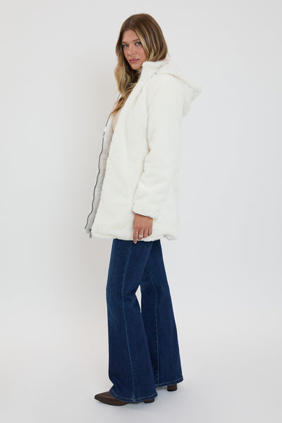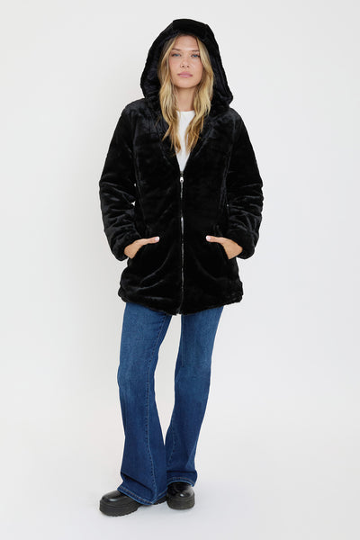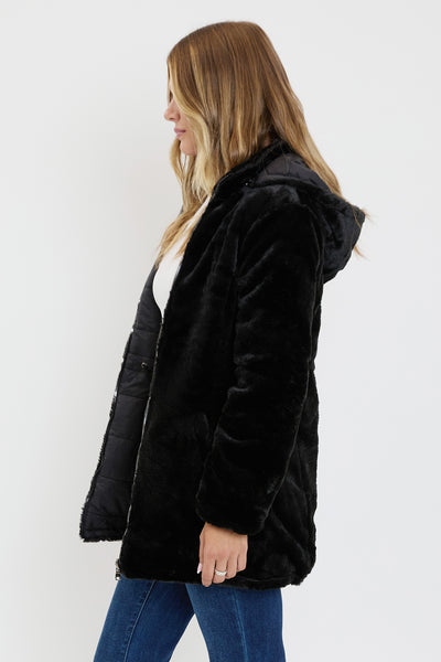Bring on the cold! Our Faux Fur Reversible Jacket has you covered and cozy! Our reversible jacket has everything you need this season! One side features a quilted puffer jacket with a soft and fuzzy interior. It also has 2 front pockets and drawstrings to cinch you in at the waist. The other side features a comfy-as-a blanket faux fur exterior with a light and airy quilted interior, and 2 front pockets. Both sides have a detachable zippered hood for convenience and ease! Believe us when we say you won’t want to take this jacket off! Style it with your favorite YMI jeans, boots, and a beanie for a chic look, or wear it more comfy with sweatpants and sneakers!