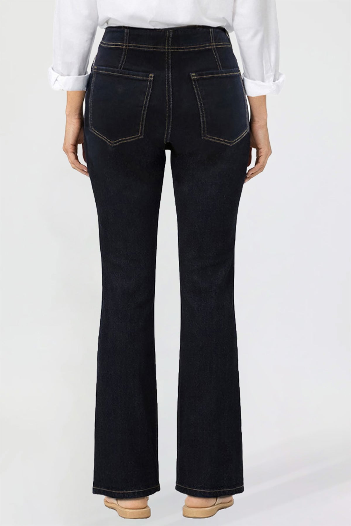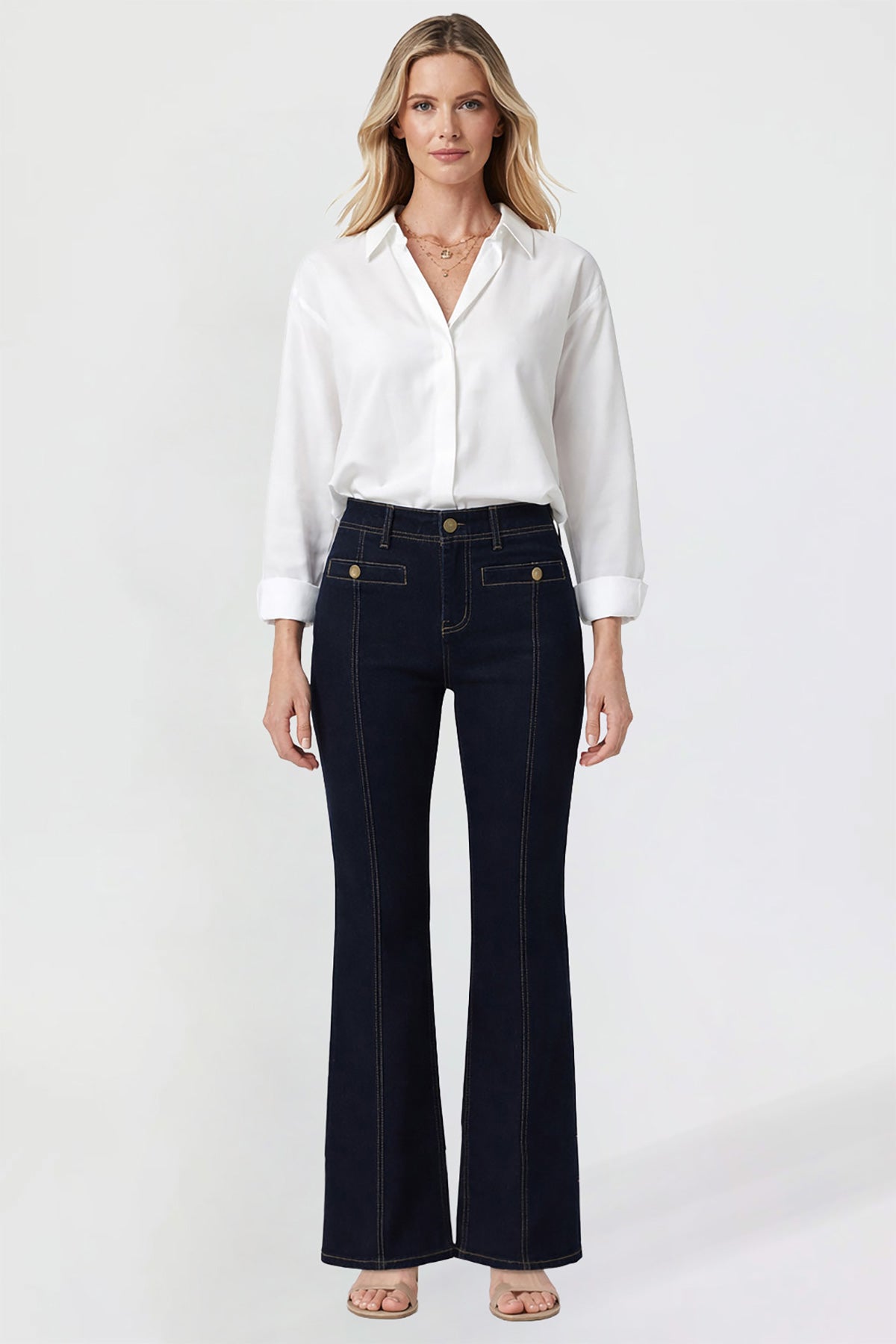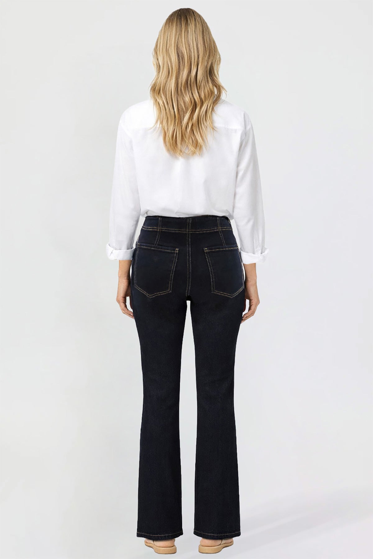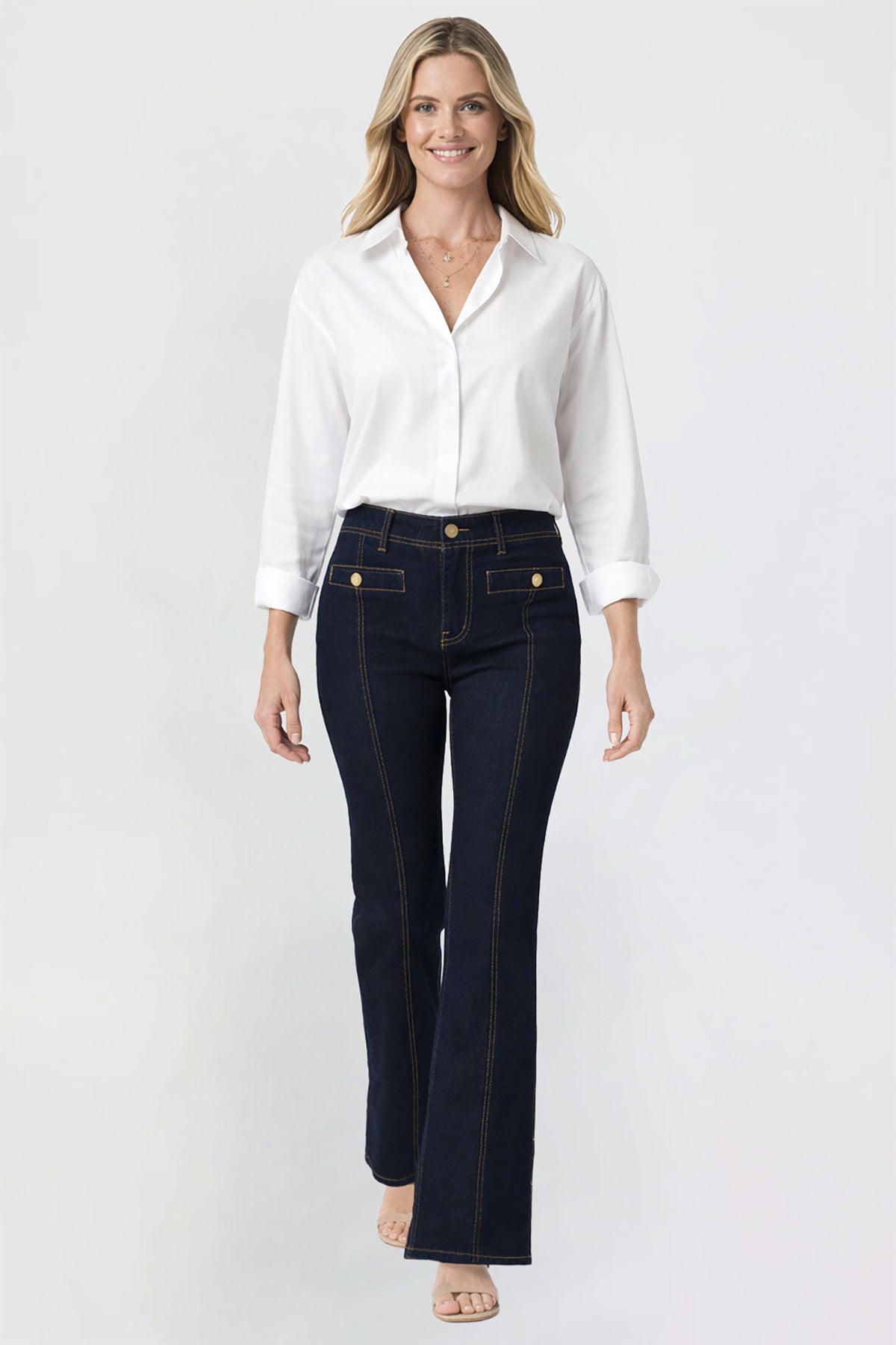 Elevate your denim collection with our Women’s Pin Tuck Bootcut Jeans. Designed with a flattering high-rise fit and subtle pin tuck detailing, these jeans offer a polished silhouette that elongates the leg. Featuring functional back pockets, front welt pockets, and a classic button-and-zipper fly, they combine timeless denim style with modern comfort. Made from a soft stretch blend, these bootcut jeans move with you while maintaining their shape for all-day wear.