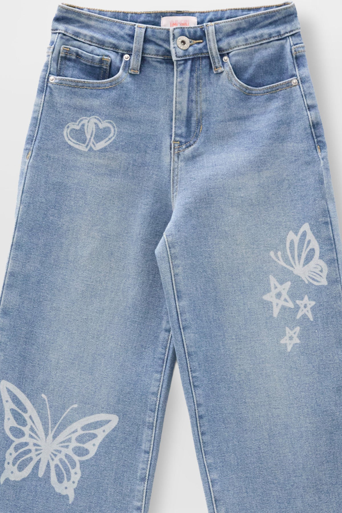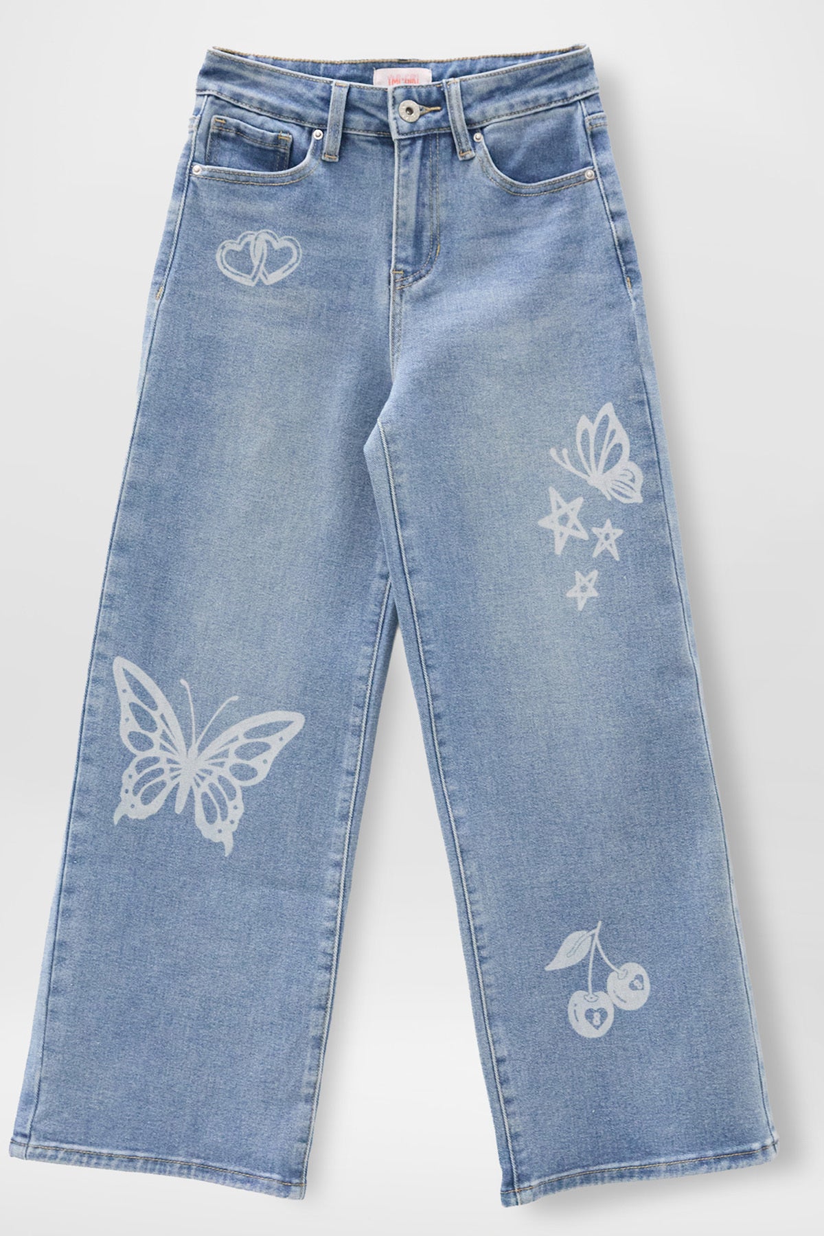 Make a bold style statement with our Girls Tattoo Print Wide Leg Jeans. Designed to stand out, this playful pair features allover tattoo-inspired prints, including butterflies, stars, hearts, and cherries for a fun, expressive look she’ll love. The relaxed, wide-leg fit delivers effortless comfort, while classic denim details like a button-and-zipper closure and five-pocket design keep them easy to wear and style. Made from a soft stretch denim blend, these jeans are perfect for adding personality to everyday outfits.